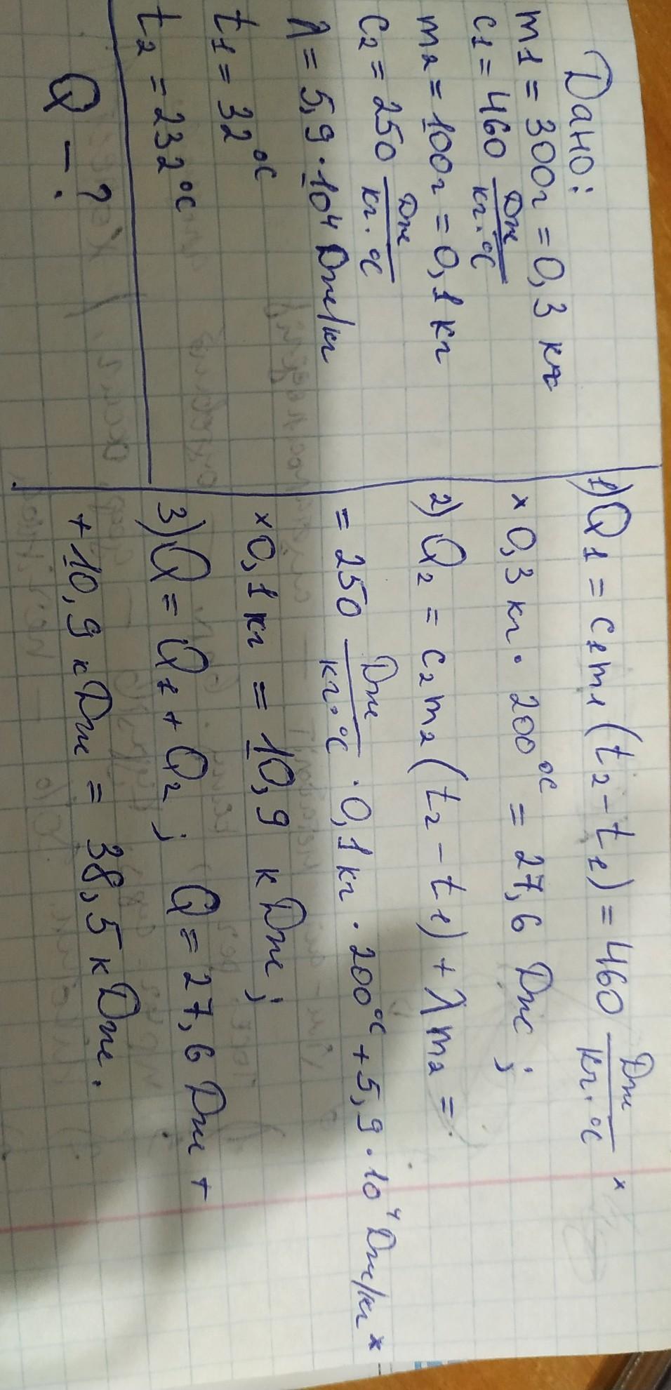 У залізній баночці масою 300 г розплавили 100 г олова. Яка кількість теплоти пішло на нагрівання бо ночки та плавлення олова? Якщо  їх початкова температура  32°С
