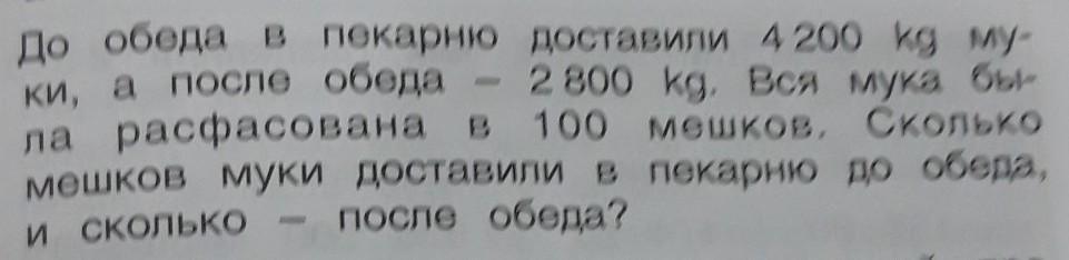 1) 4200+2800=7000 находим количества муки; 2) 7000÷100=70 находим количество муки в одном мешке; 3) 4200÷70=60 сколько мешков муки привезли до обеда ; 4) 2800÷70=40 сколько мешков муки привезли после обеда; 5) 60 мешков муки привезли до обеда , и 40 мешков муки привезли после обеда