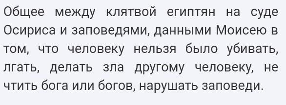 ответ:ОБЩЕЕ МЕЖДУ КЛЯТВОЙ ЕГИПТЯН НА СУДЕ ОСИРИСА И ЗАПОВЕДЯМИ,ДАННЫМИ МОИСЕЮ В ТОМ ,ЧТО ЧЕЛОВЕКУ НЕЛЬЗЯ БЫЛО УБИВАТЬ ,