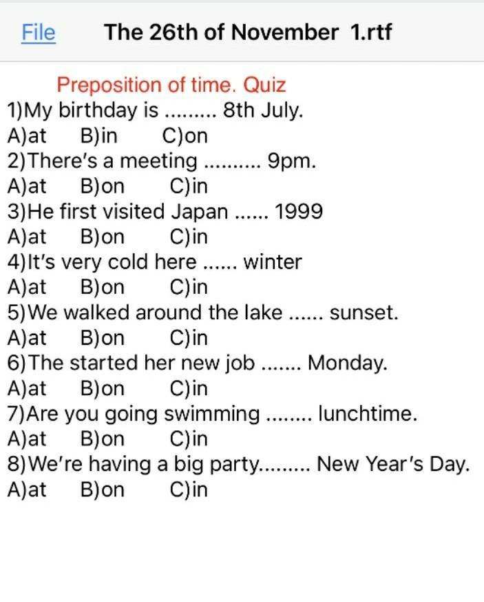 если вдруг учительница спросит, то предлог "at" используем тогда, когда хотим сказать день(понедельник, вторник и т.д.) или время(после обеда, до обеда и т.д.)