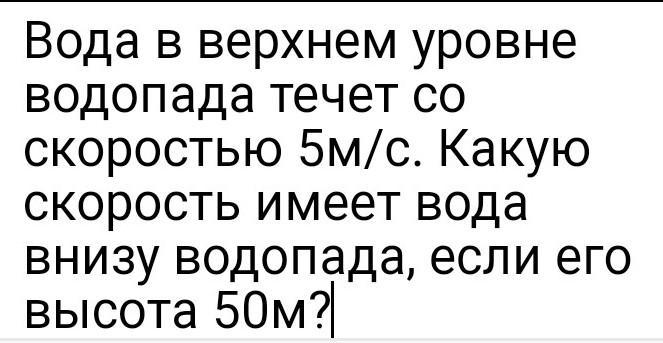 Задача некорректная, вода падает не совсем так, как камень. Приблизительно так: Вверху Е=m*v*v/2+m*g*h; Внизу E=m*V*V/2; Значит V*V=v*v+2*g*h=25+2*9.8*50=1005; V=31.7 м/с