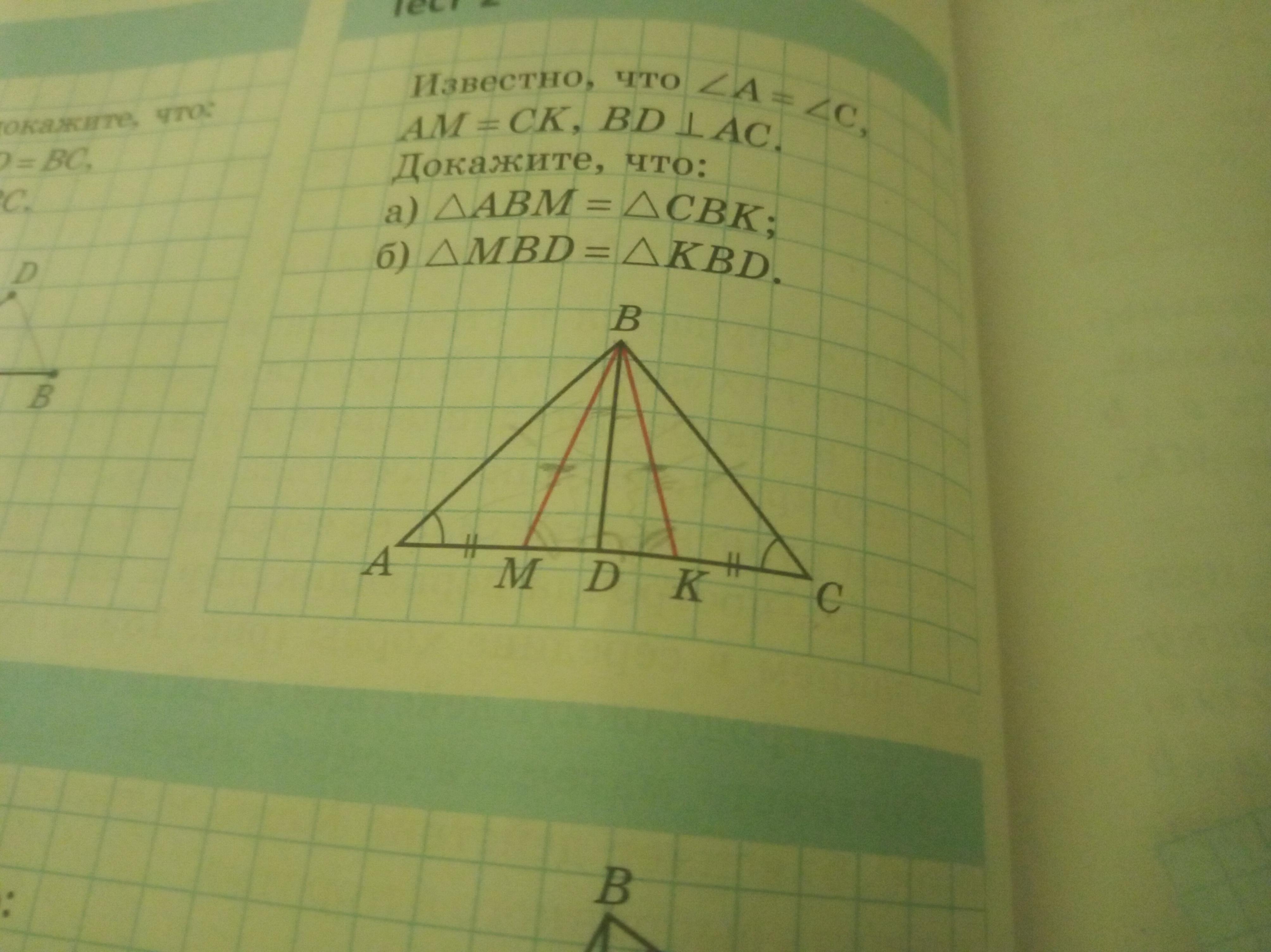 б) если АМ=СК, то МD=DK, BD перпендикуляр так мы знаем что угол D= 90° и равен для обоих треугольников. МВD=KBD по первому признаку равенства треугольников