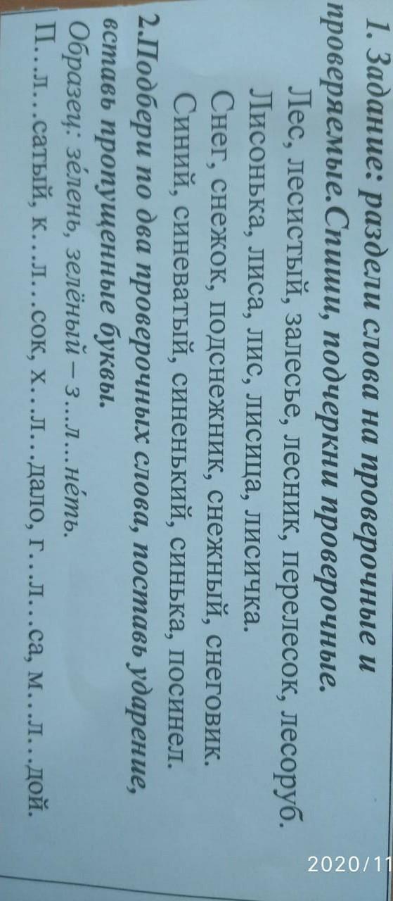 1. Проверочные: лес, залесье, перелесок, лисонька, лис, снег, подснежник, снежный, синий, синенький, синька