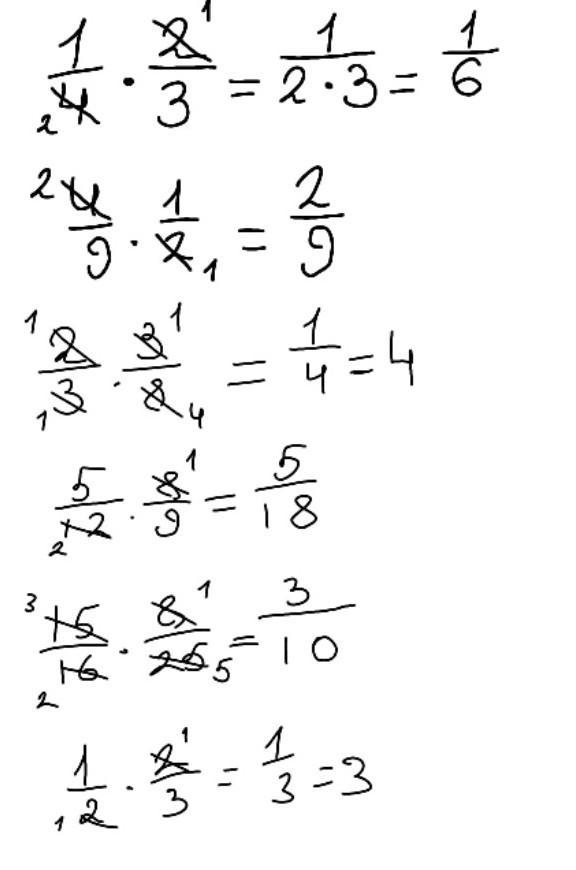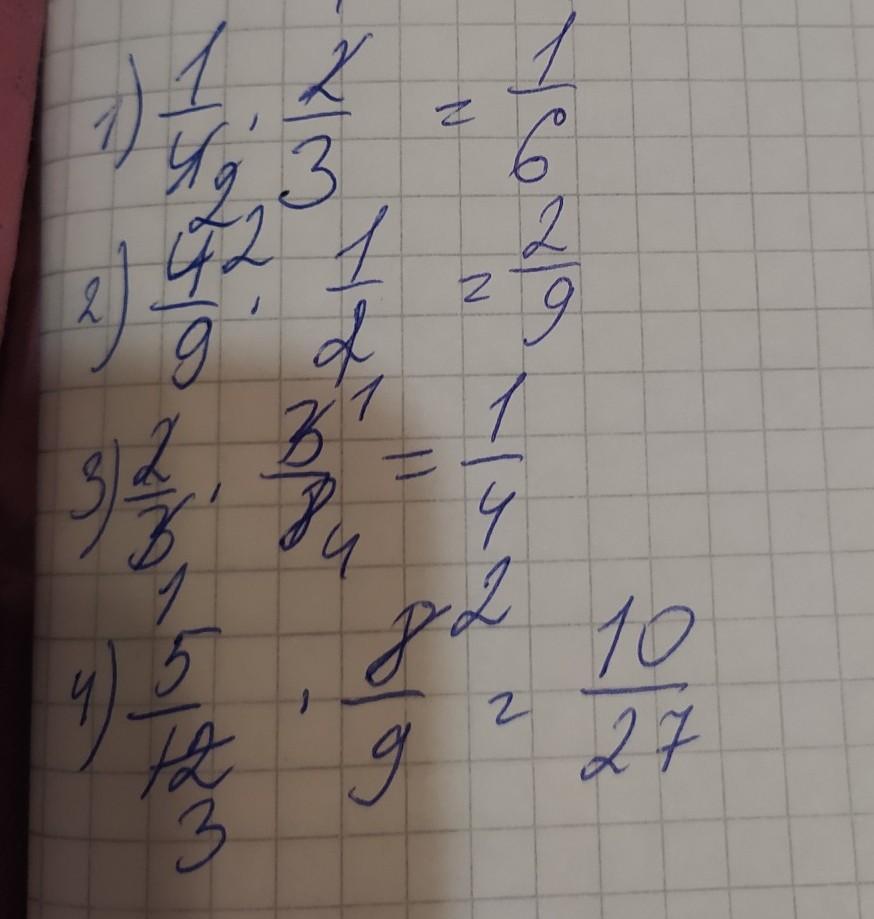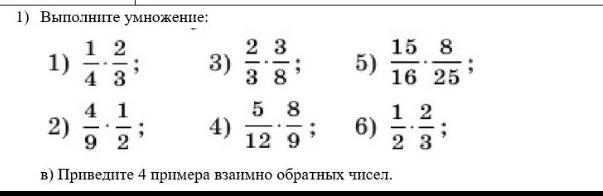 Выполни умножение : 1) 1/4 × 2/3 2) 4/9 × 1/2 3) 2/3 × 3/8 4) 5/12 × 8/9 5) 15/16 × 8/25 6) 1/2 × 2/3 в) приведите 4 примера обратных чисел