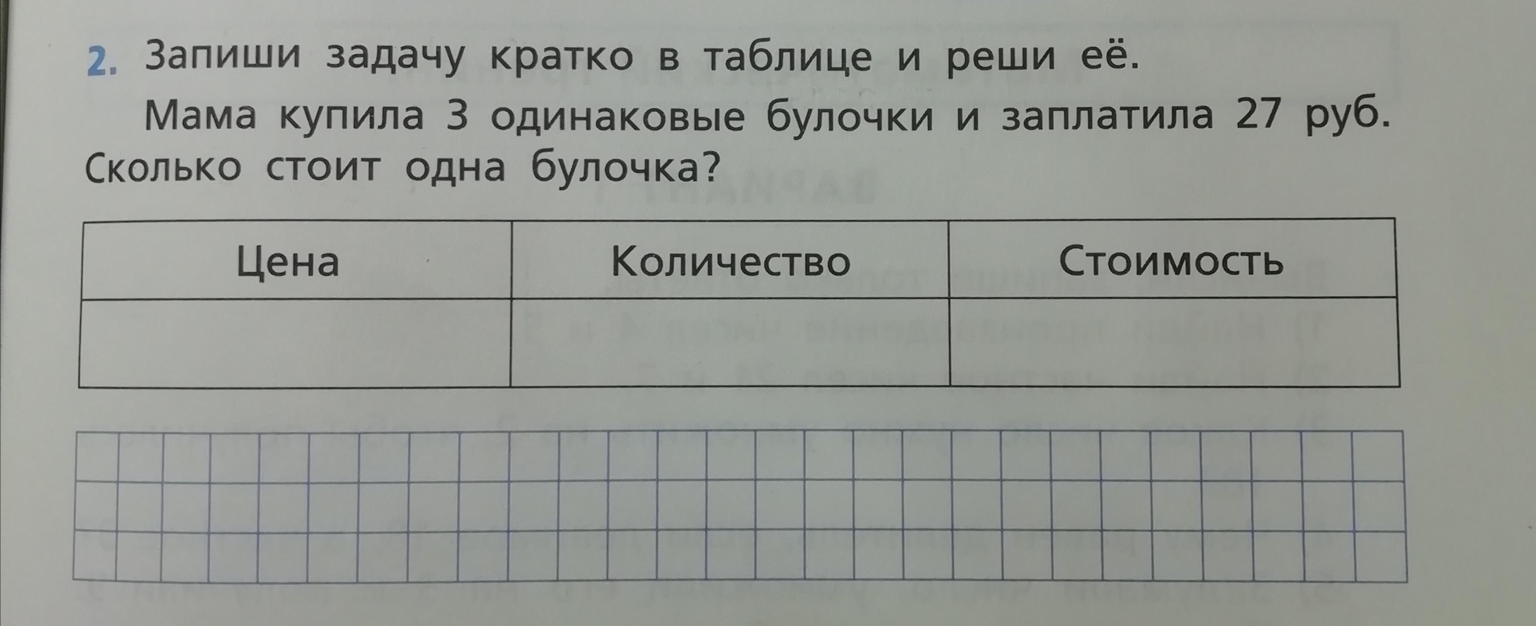 Цена: 9 (нужно 27 разделить на 3 и получим цену одной булочки)