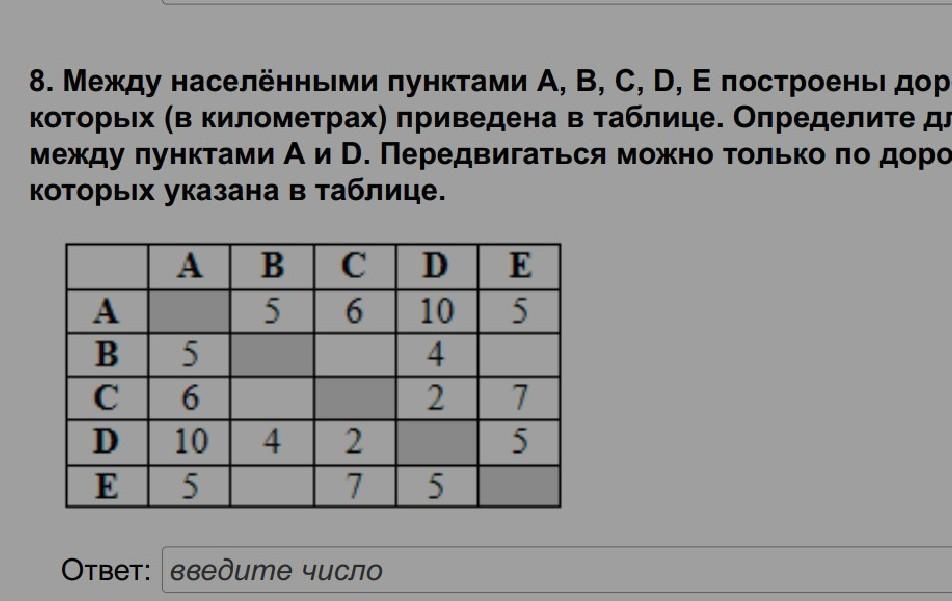 которых (в километрах) приведена в таблице. Определите длину кратчайшего пути