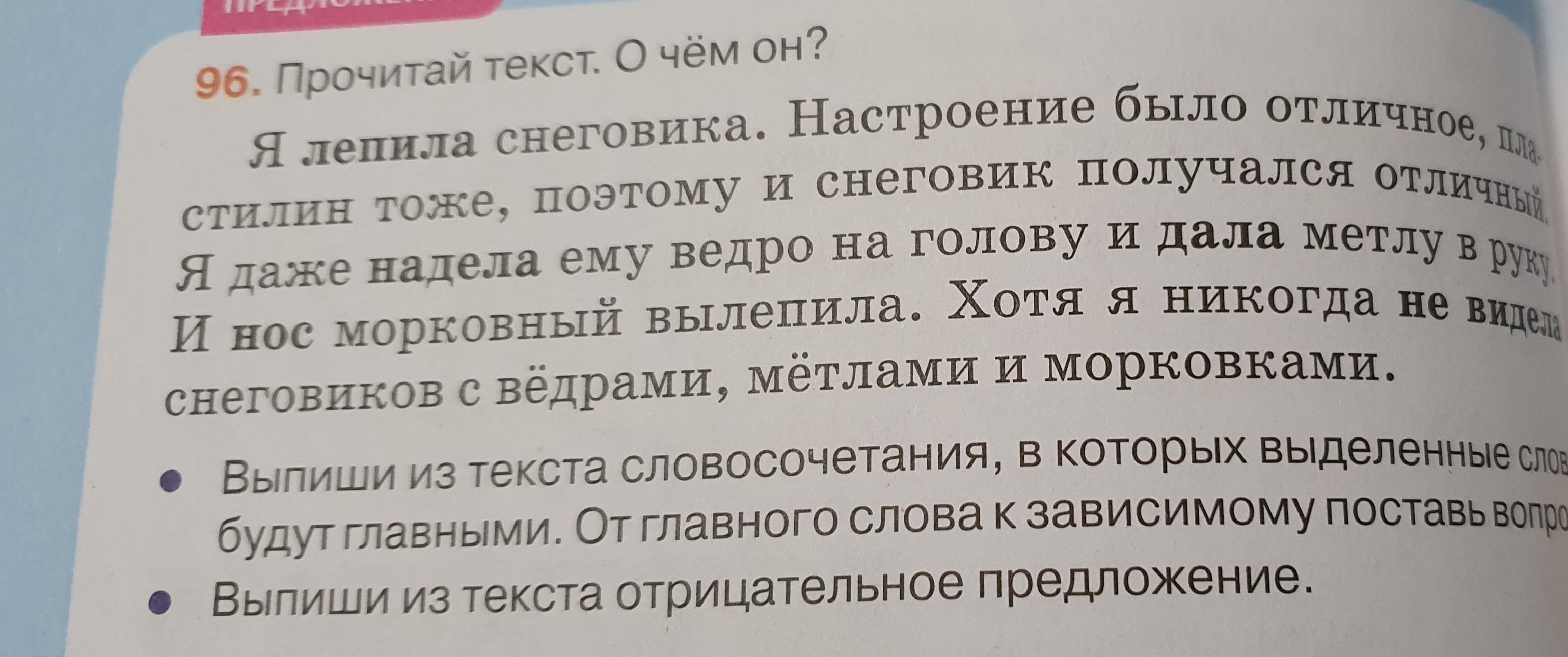 Выпеши из текста словосочетания, в которых выделеные слова будут главными. От главного слова к зависимому поставь вопрос. Выпиши из текста отрицательное предложение.