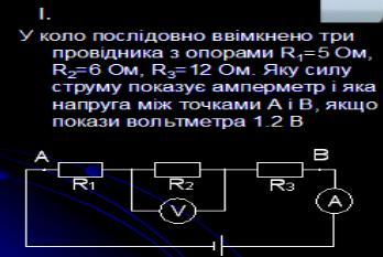 У круг последовательно включено 3 проводника из сопротивлениями R1=5 ом, R2=6 ом, R3= 12 ом. Какую силу электричества показывает амперметр и какое напряжение между точками A и B, если показания вольтметра 1.2В