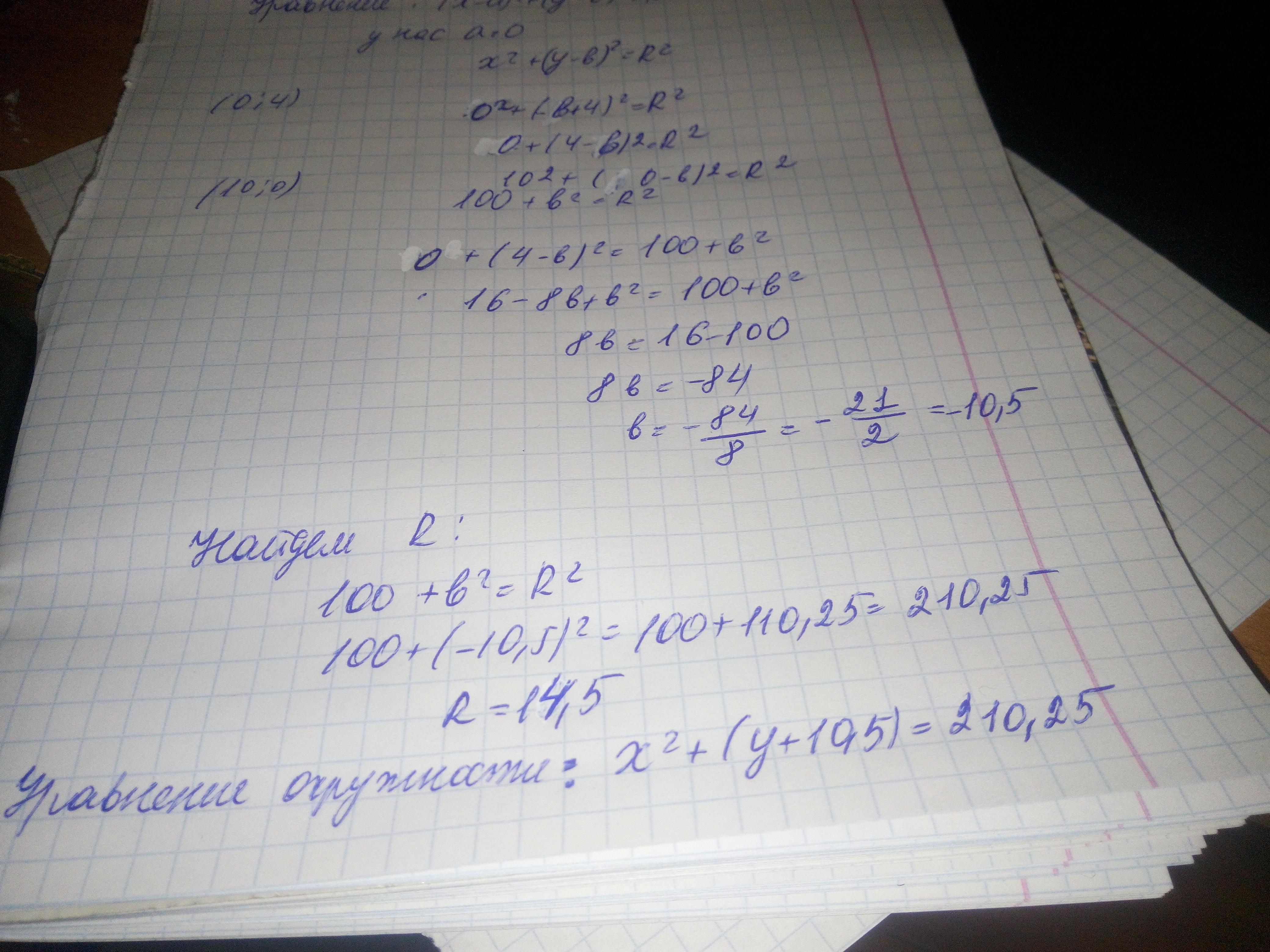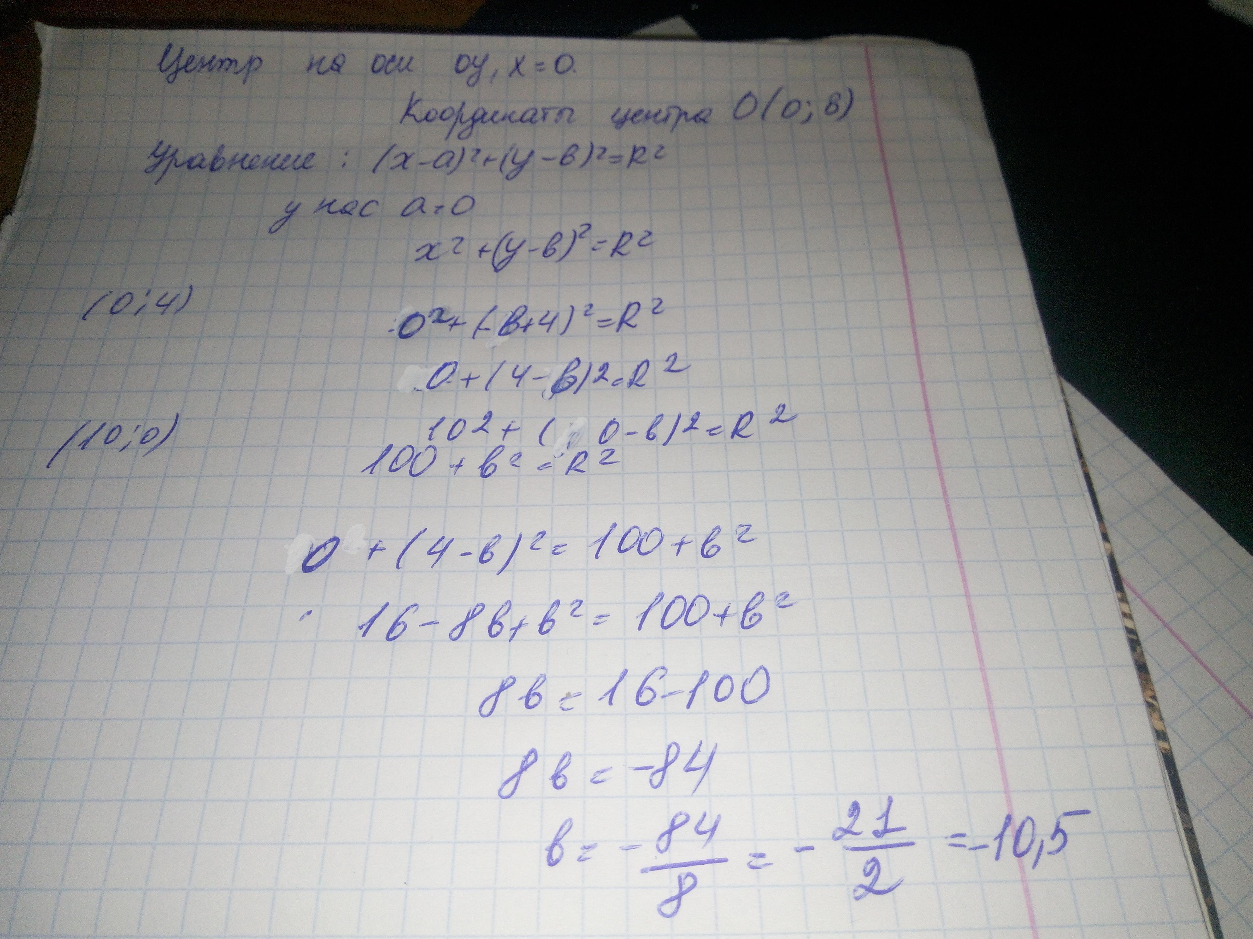 Напиши уравнение окружности, которая проходит через точку 10 на оси Ox, и через точку 4 на оси Oy, если известно, что центр находится на оси Oy.