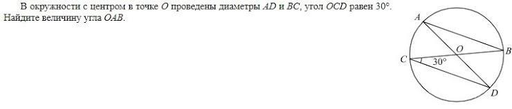 угол ОАВ=30 градусам.Треугол.АОВ=СОД,по двум сторонам (они ОА=ОВ=ОС=ОД-радиусы) и углу между ними.Значит соответствующие углы тоже равны.