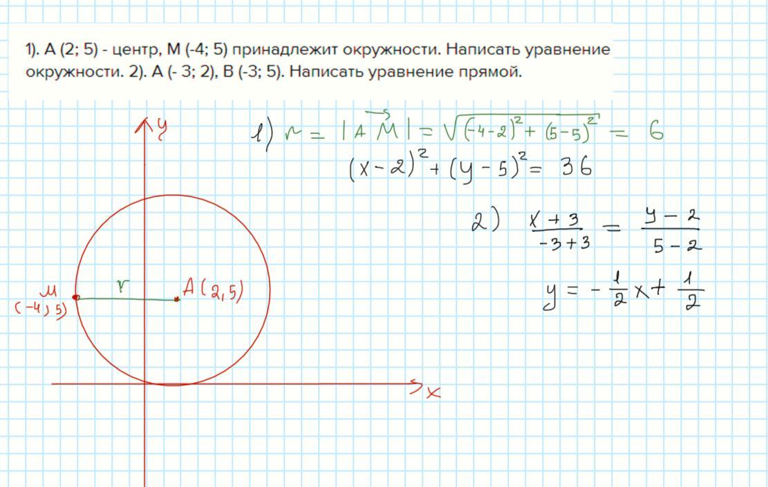 1). А (2; 5) - центр, М (-4; 5) принадлежит окружности. Написать уравнение окружности. 2). А (- 3; 2), В (-3; 5). Написать уравнение прямой.