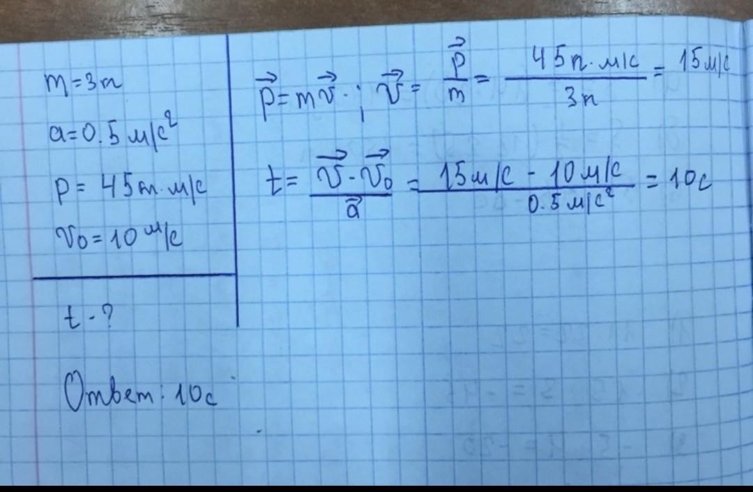 1. Тело массой 3 кг движется равноускоренно, изменение скорости тела описывается уравнением v=10-2t. Определите импульс тела в начальный момент времени и через 5 с.
