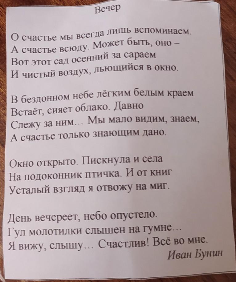 Стихотворение «Вечер», написанное Буниным в 1909 году, относится к жанру пейзажно-философской лирики. В нём поэт рассуждает о счастье в окружении классической деревенской природы.