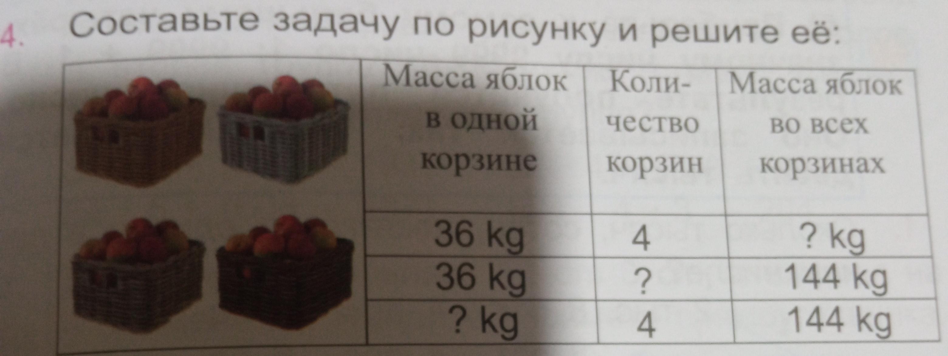 3) В магазин привезли 144кг яблок в четырех ящиках. Сколько кг яблок в одном ящике?