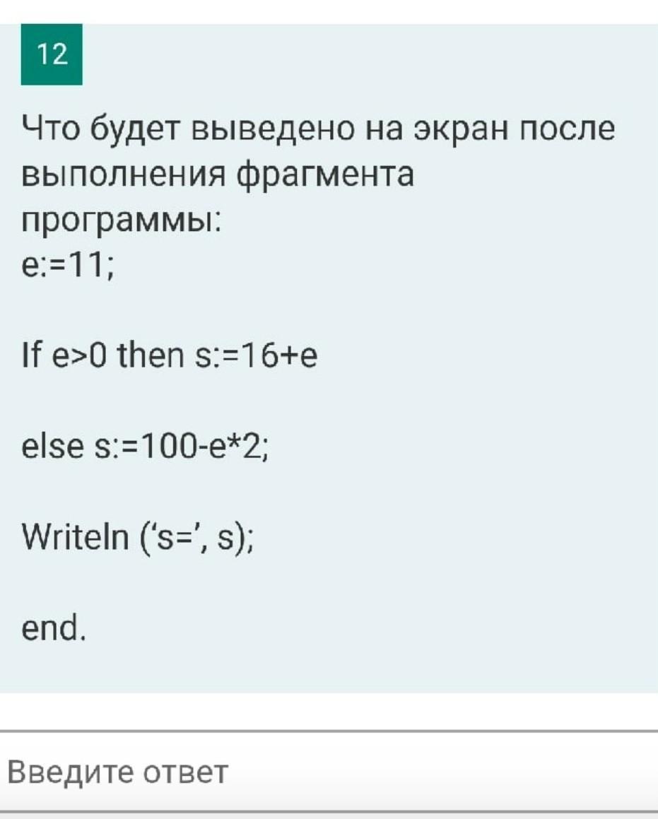 У нас условие, если е (11) > 0, то мы s: = 16 + 11 = 27 иначе s: = 100 – 11 * 2 = 100 – 22 = 78.