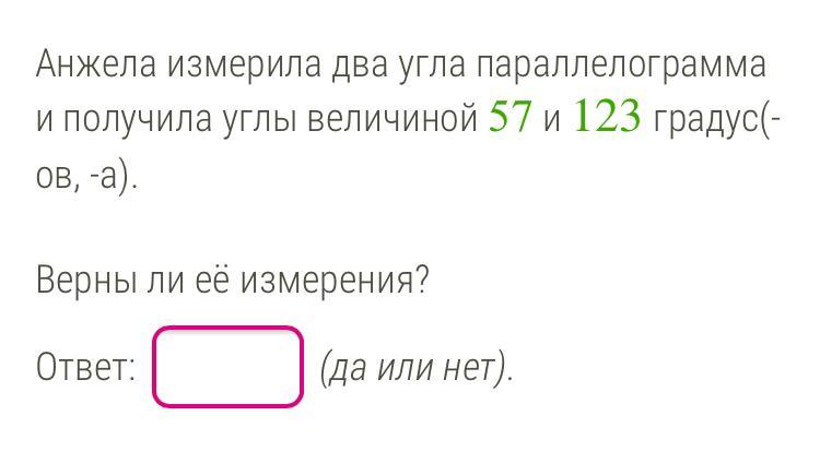 Судя по измерениям -эти углы не могут быть противолежащими , значит эти углы прилежат к одной стороне . А сумма углов прилежащих к одной стороне параллелограмма равна 180°. Следовательно , измерения Анжелы будут правильными , если эти углы в сумме дадут 180°, проверим
