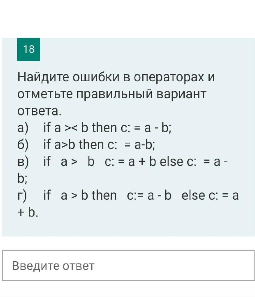 в) if a > b then c: = a + b else c: = a - b (стоит двойной пробел после «>» и «с»)