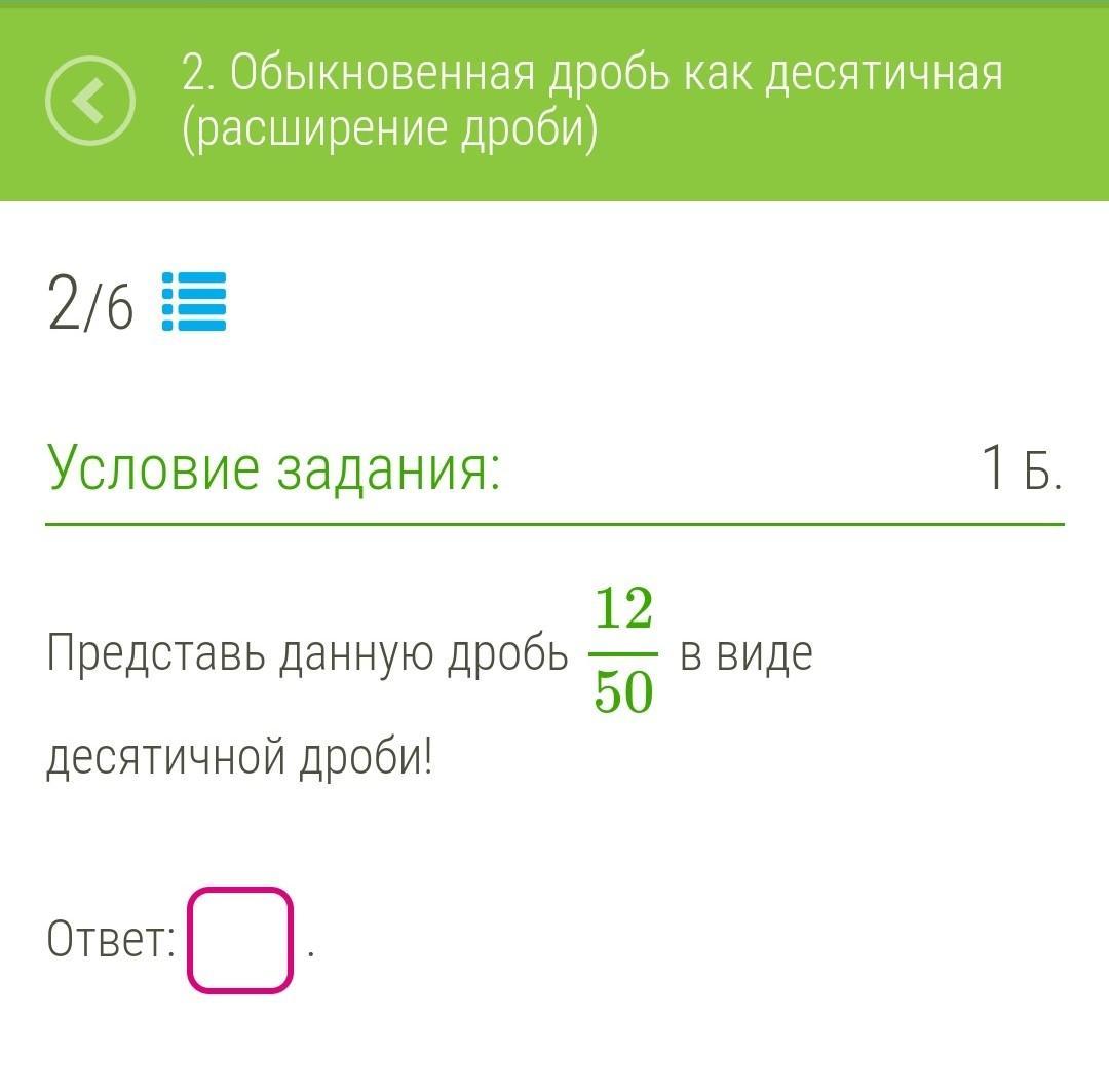 Объяснение: 12/50 = 24/100 = 0.24 (двадцать четыре сотых)