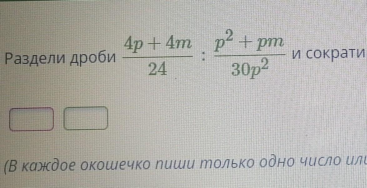 4p+4m /24 ÷ p²+pm /30p² = 4(p+m) /24 × 30p² /p(p+m) = 4/24 × 30p²/p = 1/6 × 30p = 30p/6 = 5p.