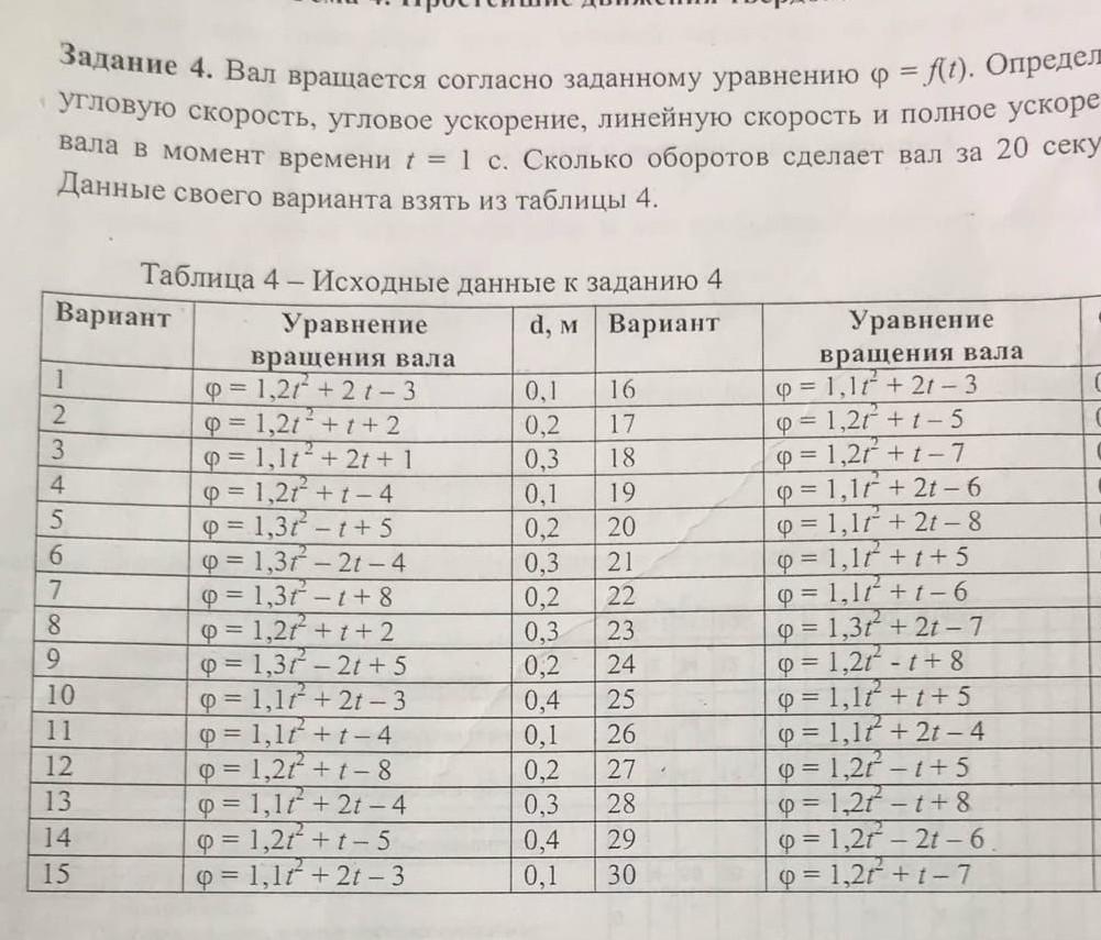 Вал вращается согласно заданному уравнению фи=1,1 r²+t-4. Определить угловую скорость в момент времени t=1с. Сколько оборотов сделает вал за 20 секунд?