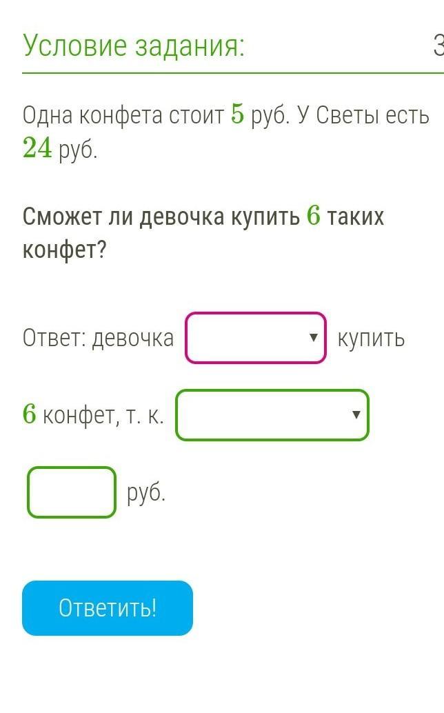 не сможет; тк ей хватит только на 4 конфеты и у нее останется 4 рубля. а чтобы купить 6 конфет нужно 30 рублей