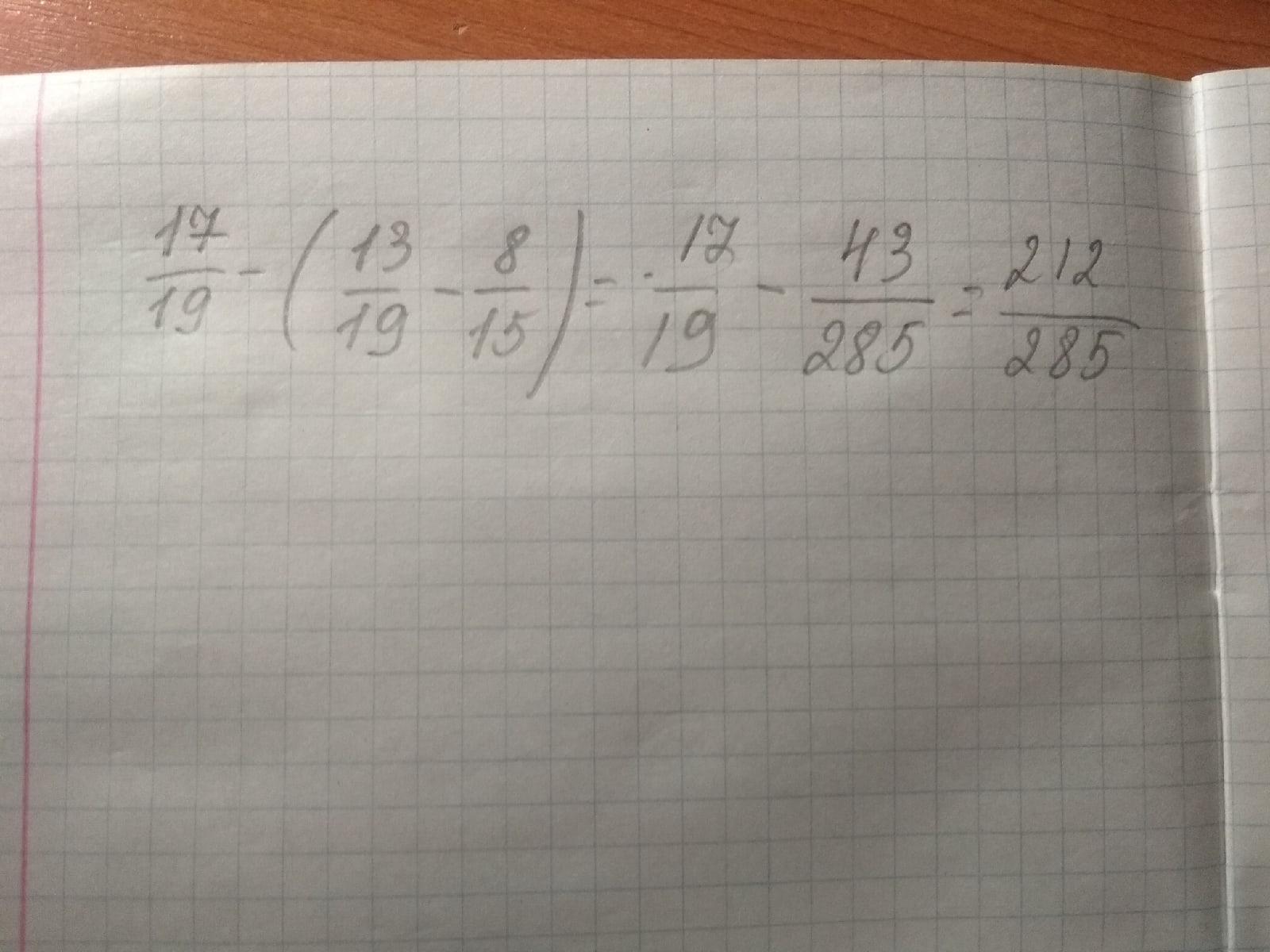 17/19-(13/19-8/15)= 212/285 1)13/19-8/15=43/285 2)17/19-43/285=212/285 всё правельно 100 процентов