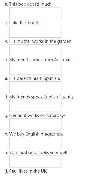 Ответ: a. This book doesn't cost much; b. I don't like this hotel; c. His mother doesn't work in the garden; d. My friends doesn't come from Australia; e. His parents don't Spanish; f. My friends don't speak English fluently; g. Her aunt doesn't work on Saturdays; h. We don't buy English magazines; i. Your husband doesn't cook very well; j. Paul doesn't live in the UK