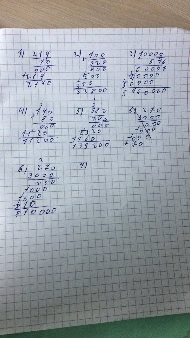 Выполните умножение: 1)214*10; 2)100*328; 3)10000*546; 4)140*80; 5)580*240; 6)270*3000. В столбик