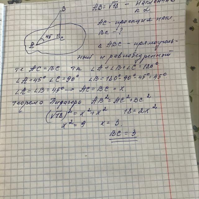 Наклонная образует с плоскостью угол 45°. найдите расстояние от конца наклонной до плоскости, если длина наклонной равна √18см.