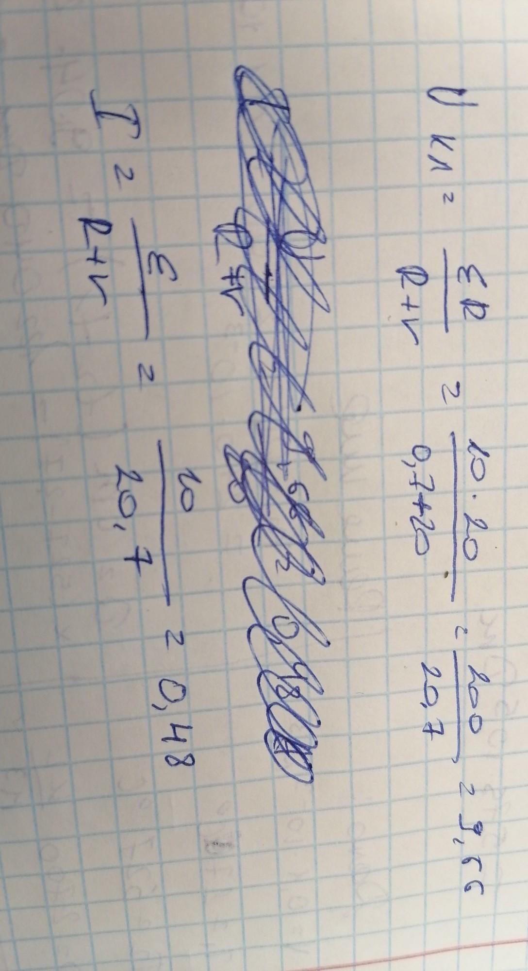 ЭДС батареи 10 В, её внутреннее сопротивление 0,7 Ом, сопротивление внешней цепи 20 Ом. Найдите силу тока в цепи, напряжение на зажимах батареи и падение напряжения внутри батареи.