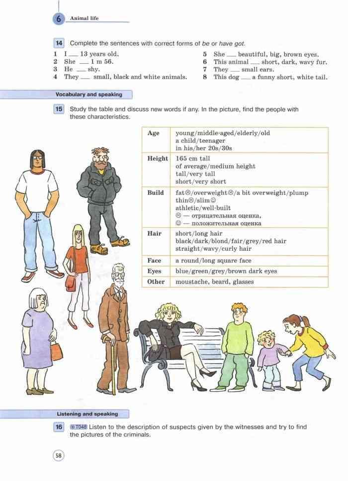 Look at the pictures of people on page 58 (Student's book part 1), choose one of them and describe his/her age, height, build, hai, face and eyes