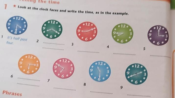 6. Six fifteen 5. Tird o’clock 2. Half of nine 4.by finfteen nine 3nine fiftheen