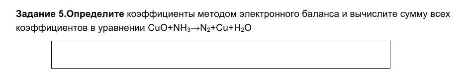 Определите коэффициенты методом электронного баланса и вычислите сумму всех коэффициентов в уравнении СuO+NH3→N2+Сu+H2O