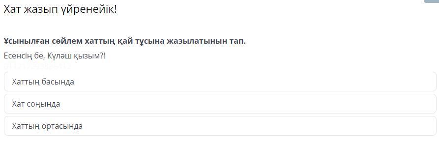 Ұсынылған сөйлем хаттың қай тұсына жазылатынын тап.