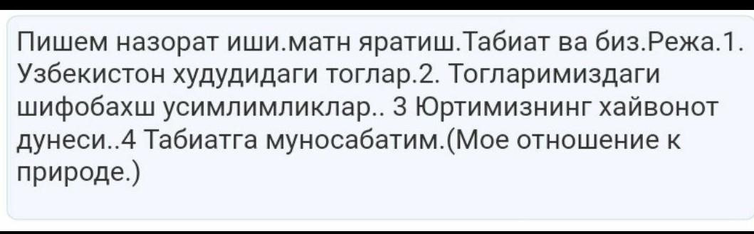 1.Узбекистан худудида Чимъён,Амирсой,Кумушкон,Чорвок каби тоглар бор.2.Шифобахш усимликлар жудахам коп,масалан:Райхон,бойчечак,тог ялпизи ва яна коп турдаги усимликлар осади.3.Юртимизнинг хайвонот дунёси жудахам бой.Бизнинг юртимизда шерлар,борилар,айиклар,тог эчкилари ва яна хар хилдаги жонзотлар бор.4.Менинг табиатга муносабатим яхши