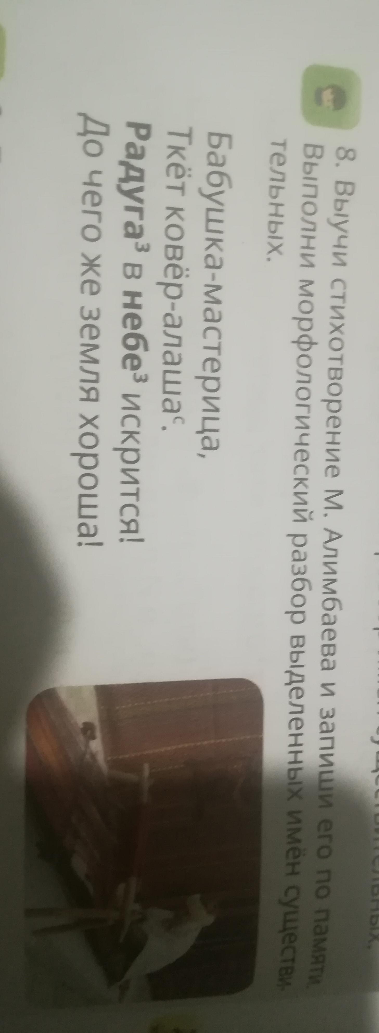 Помогите дам последние 10 баллов 8.выучи стихотворение и. Алимбаева и запишы его по памяти выполни марфологический разбор выделенных имён существительных