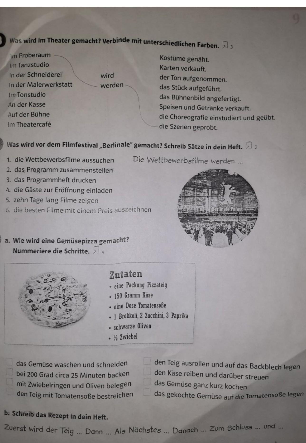 Zuerst wird der Teig ausgerollt. Dann wird das Gemüse gewaschen, geschnitten und ganz kurz gekocht. Dann wird der Teig mit Tomatensoße bestrichen. Als Nächstes wird das gekochte Gemüse auf die Tomatensoße gelegt und der Teig mit Zwiebelringen und Oliven belegt. Danach wird der Käse gerieben. Zum Schluss wird der Käse darüber gestreut und die Pizza bei 200 Grad circa 25 Minuten gebacken.
