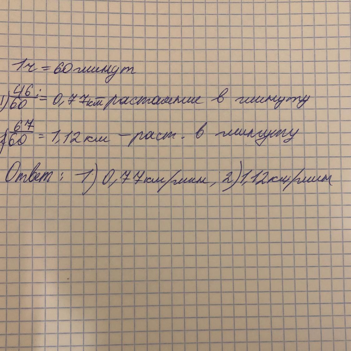 Автомобиль за 1 час проежает 1)49 км 2)67км расстояние, которое автомобиль проежает за 1мин, записать с помощью десятичной дроби. Округлив результат до сотых долей километра.