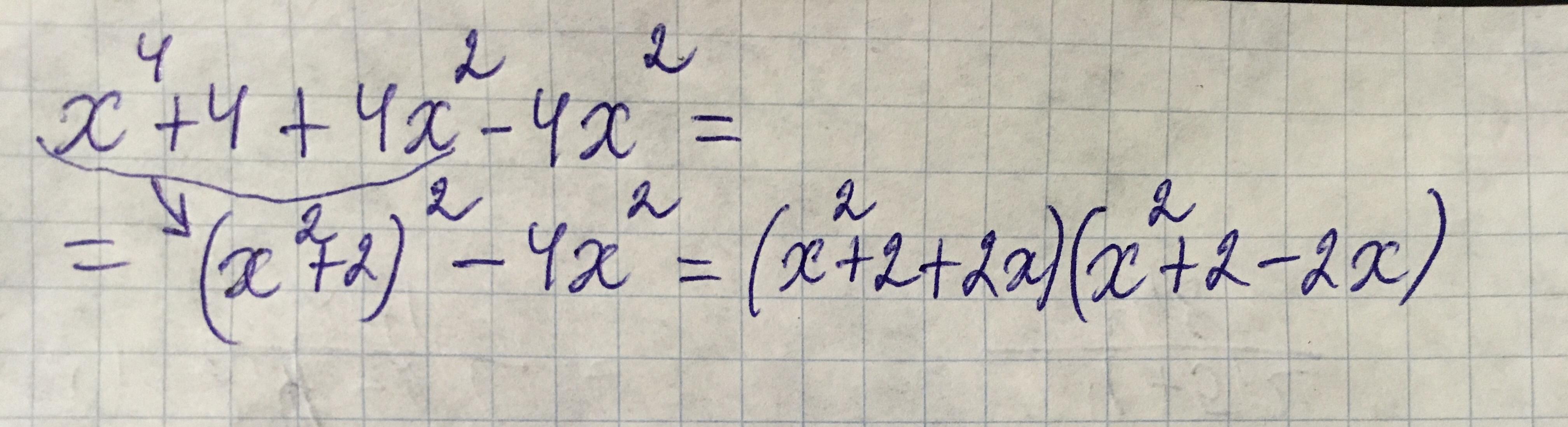 Вывод: x^4+4=(x^2+2)^2-4x^2=(x^2+2+2x)(x^2+2-2x)