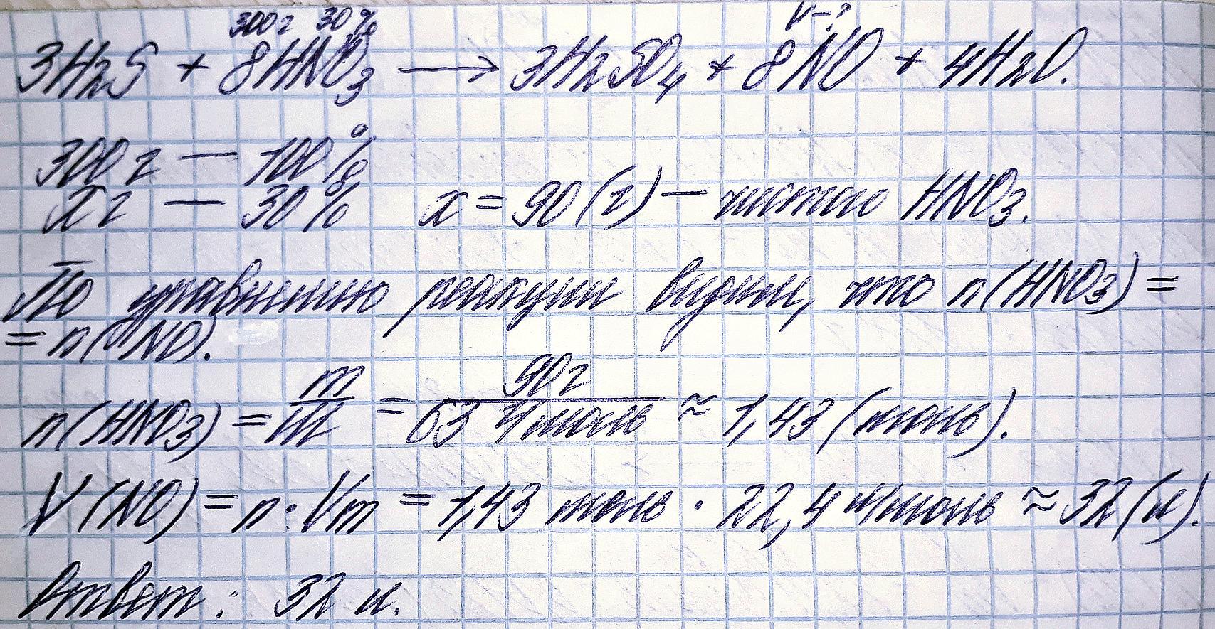 Помогите пожалуйста с задачей.Сероводород пропустили через 30 %-ый раствор азотной кислоты массой 300г. Определите объём оскида азота(2)