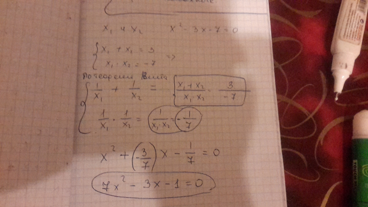 пусть х1 и х2-корни квадратного уравнения х^-3х-7=0.Составте квадратное уравнение ,корнями которого являются числа 1/х1 и 1/х2