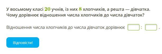 Ответ: 20-8=12 дівчаток, відношення чила хлопці до дівчат =4:6