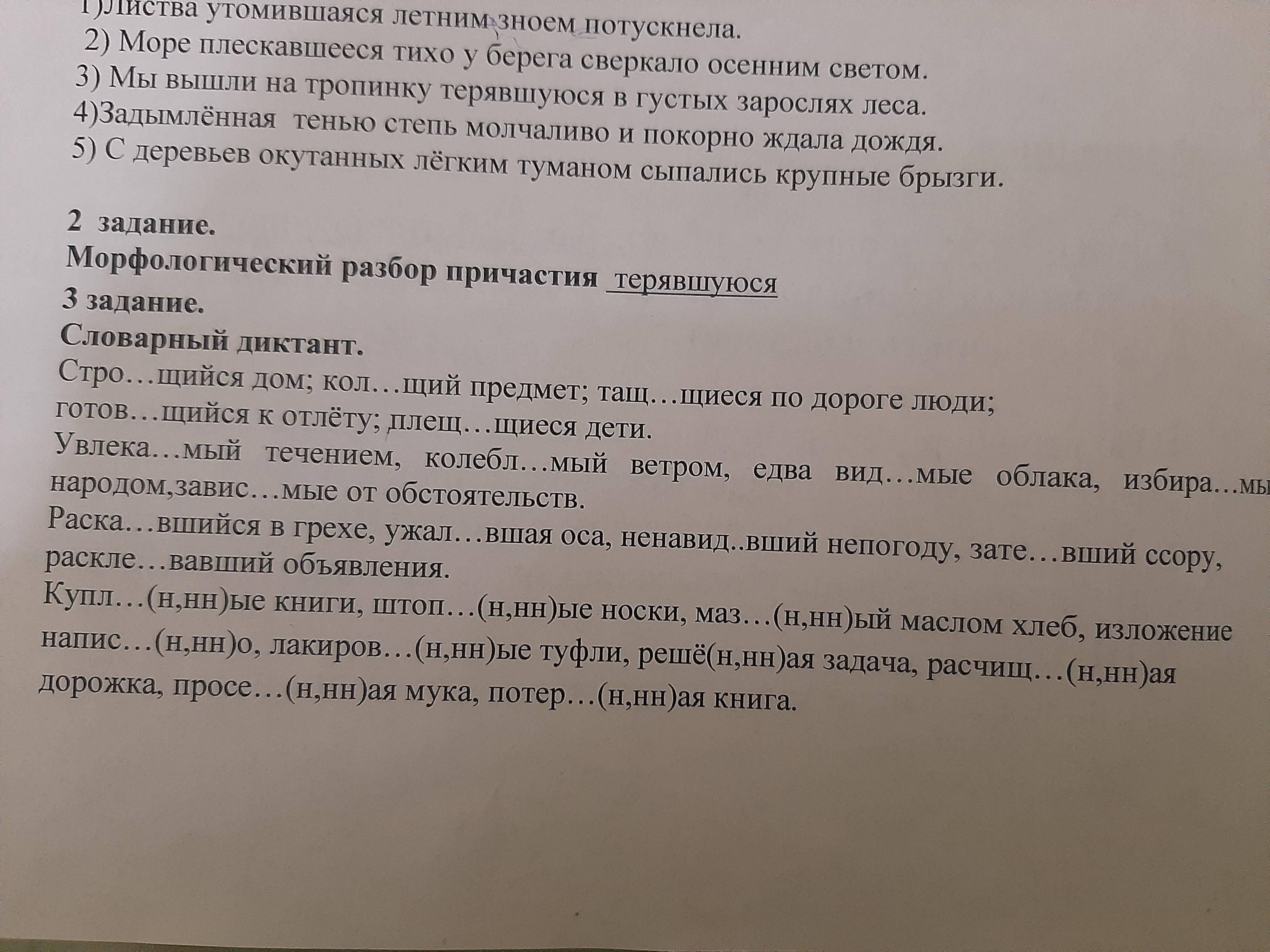 Купленные книги, штопаные носки, мазанный маслом хлеб, изложение написано, лакированные туфли, решенная задача, расчищенная дорожка, просеянная мука, потерянная книга.