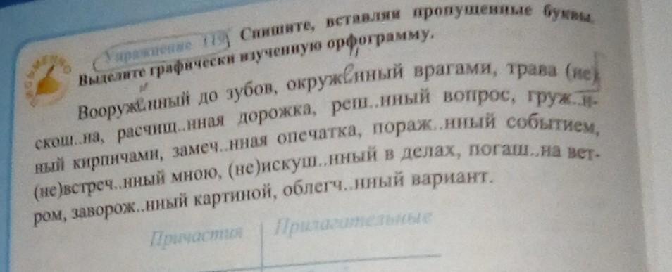 упражнение 119 седьмой классСпишите вставляя пропущенные буквы Выделите графические изученные орфограммы
