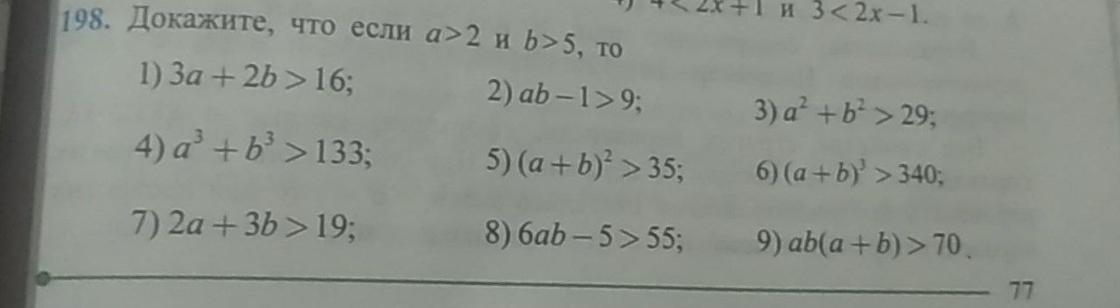 Подставляешь везде значения а и б из условия, в итоге слева получится либо больше чем справа, либо равно (как в 9 случае в конце будет 70>70).