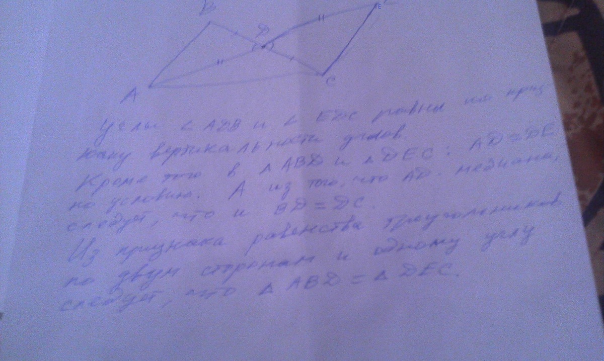 Медиана AD треугольника ABC продолжена за точку D на отрезок,DE,равный AD ,точка E соединена с точкой C.Докажите ,что треугольник ABC равен треугольнику ECD.
