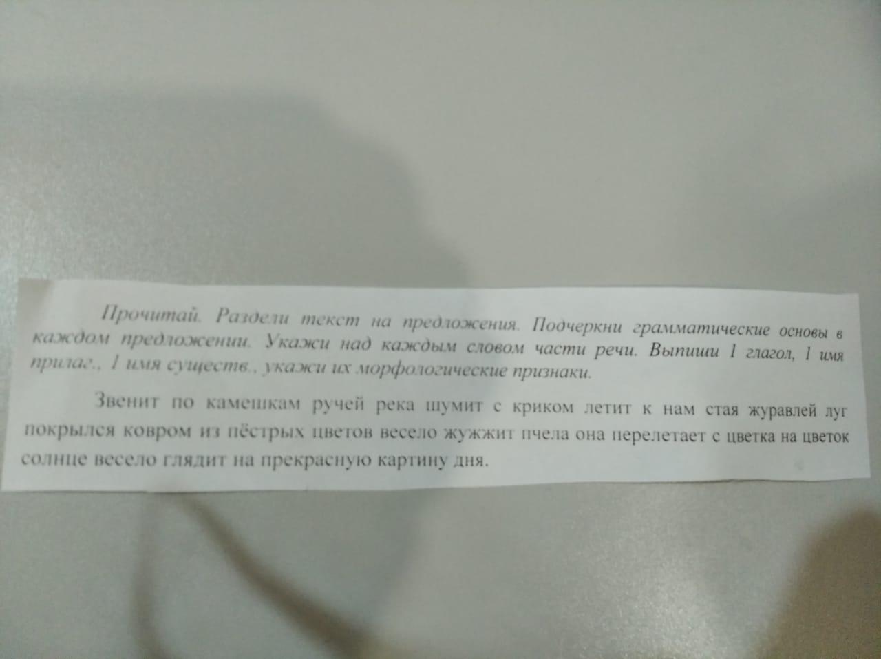 Раздели текст на предложения. Подчеркни грамматические основы в каждом предложении. Укажи над каждым словом части речи. Выпиши 1 глагол, 1 имя прилаг.,1 имя существительное. Укажи морфологические признаки.