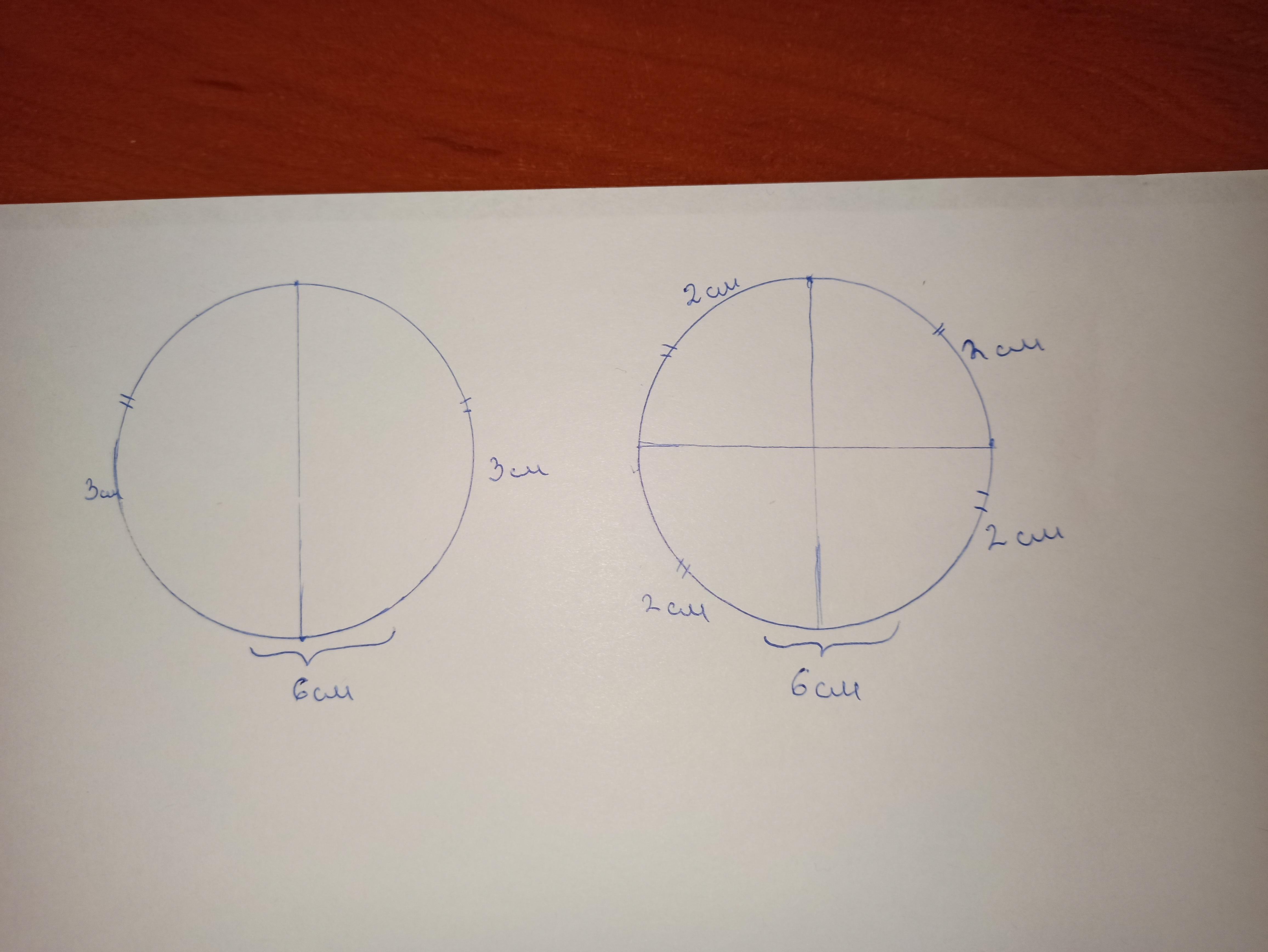 начертите три круга диаметром6см.разделите второйкруг раздели на2 равные части,а третий круг на 4 равные части.