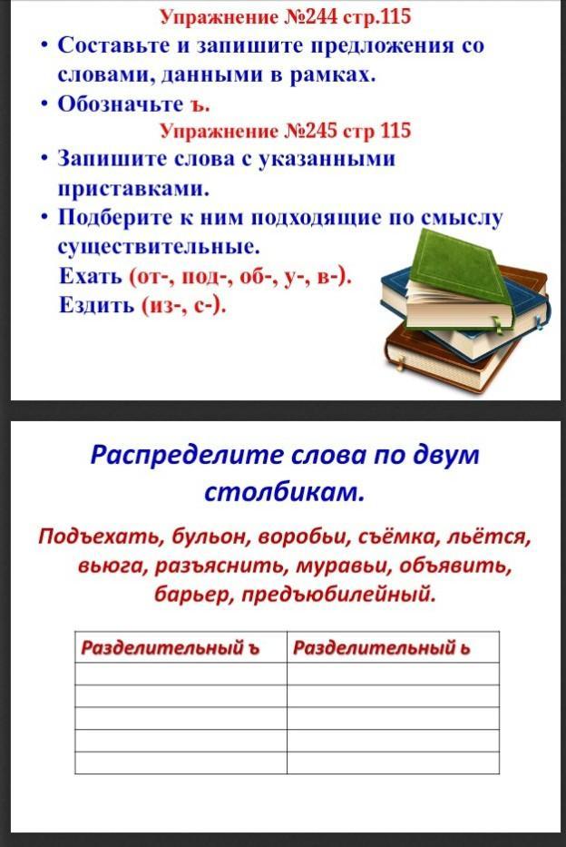 В первый столбик записать слова в которых есть Ъ, а во второй с Ь