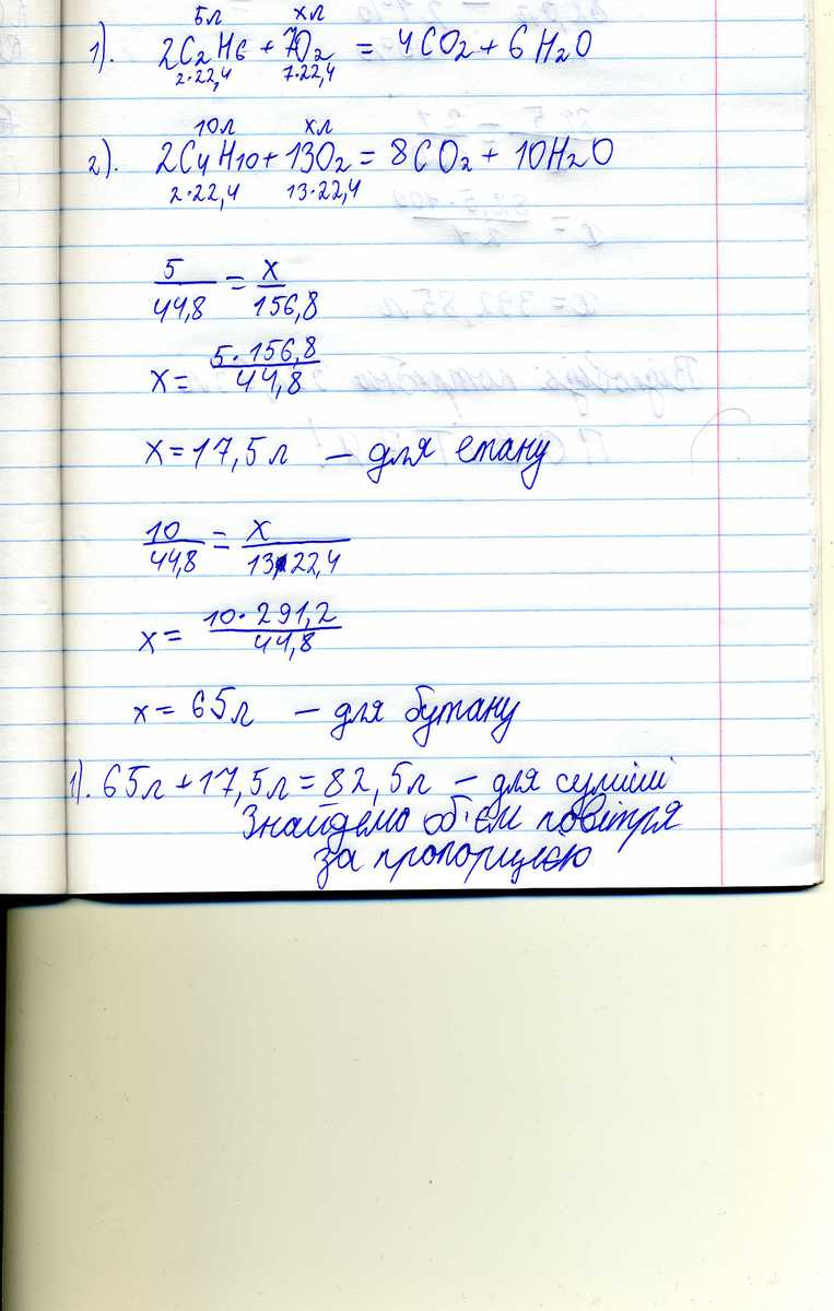 Який об'єм повітря необхідний для спалювання суміші етану об'ємом 5 л з бутаном об'ємом 10 л? Об'ємна часка кисню у повітрі становить 21 %. Всі об'єми приведені до нормальних умов.